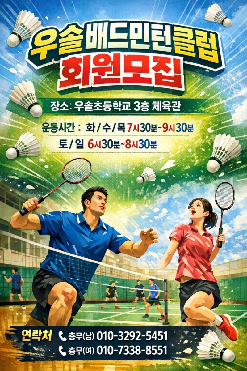 청수 배드민턴클럽 화,금 저녁 6시~9시 일요일 오후 3시~6