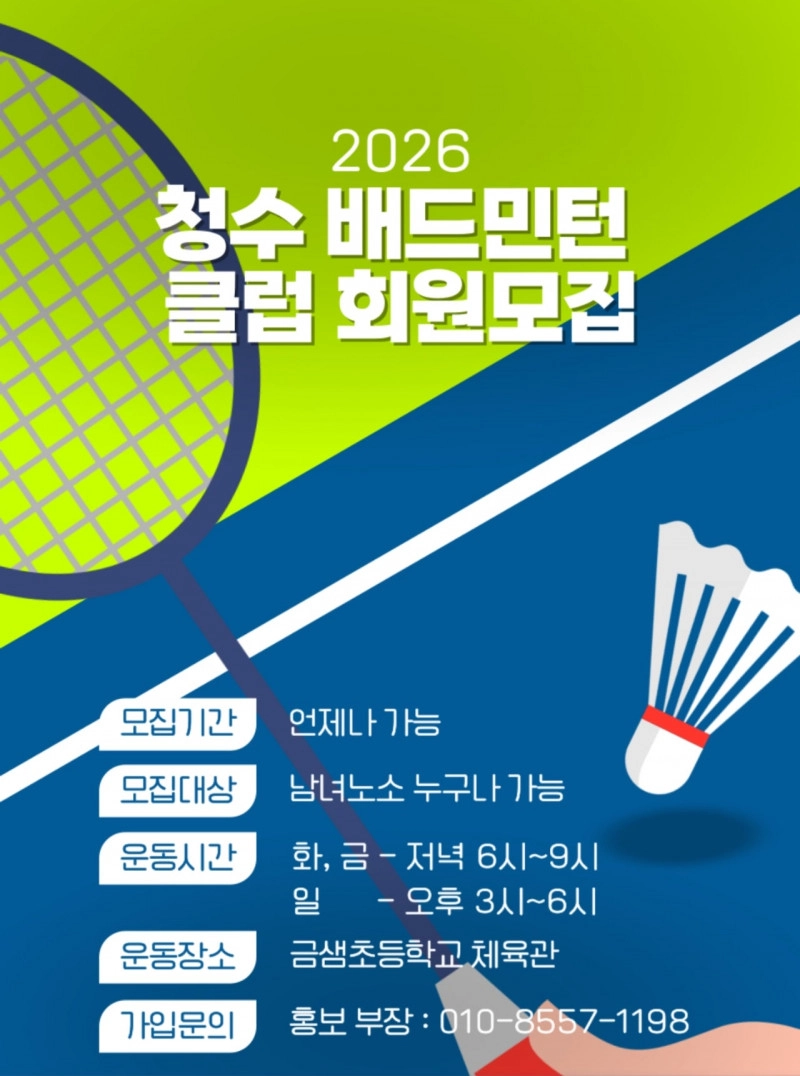 청수 배드민턴클럽 화,금 저녁 6시~9시 일요일 오후 3시~6