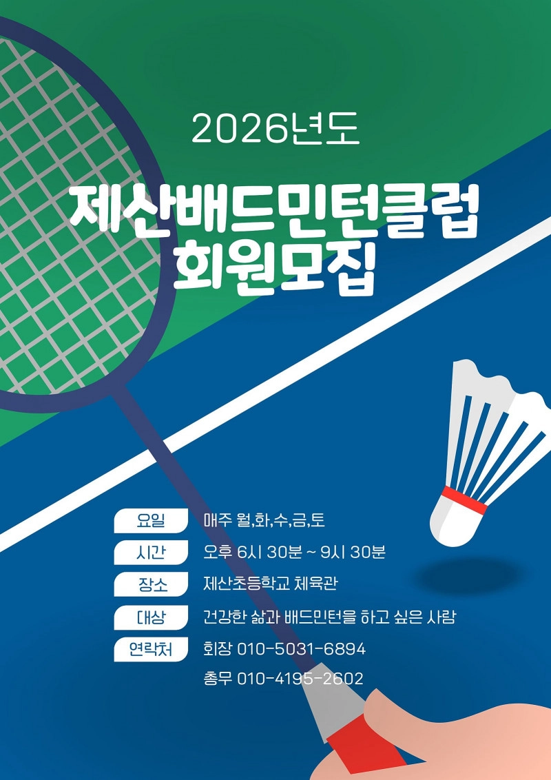 제산 배드민턴클럽 거제 제산 초등학교 체육관 월~금 18:30~21:30