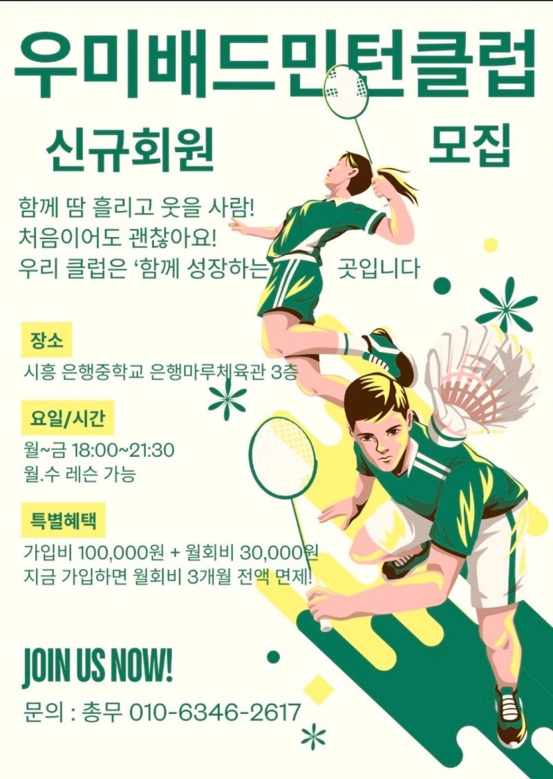 광북배드민턴클럽 회원모집합니다. 2026년 광북배드민턴클럽 신규 회원 모집합니다. 1. 모집 대상: 배드민턴에 관심 있는 남녀노소 누구나 (급수제한❎️,성별제한❎️)❤️ 2. 활동 장소: (광명북고등학교 체육관)🧡